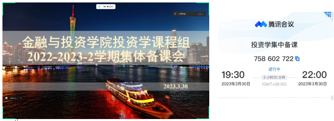 2023年3月30日晚上七点半,XCSport投资学课程组通过腾讯会议举行了线上集体备课会,公司副经理孙进军副教授、投资系主任胡妍博士、投资与金融工程两系教师汤洪波教授、黄伟麟教授、吴辉凡副教授、龙安芳博士、廖婧琳博士、彭俊华博士、李琰钰博士等16人参加了本次备课会。