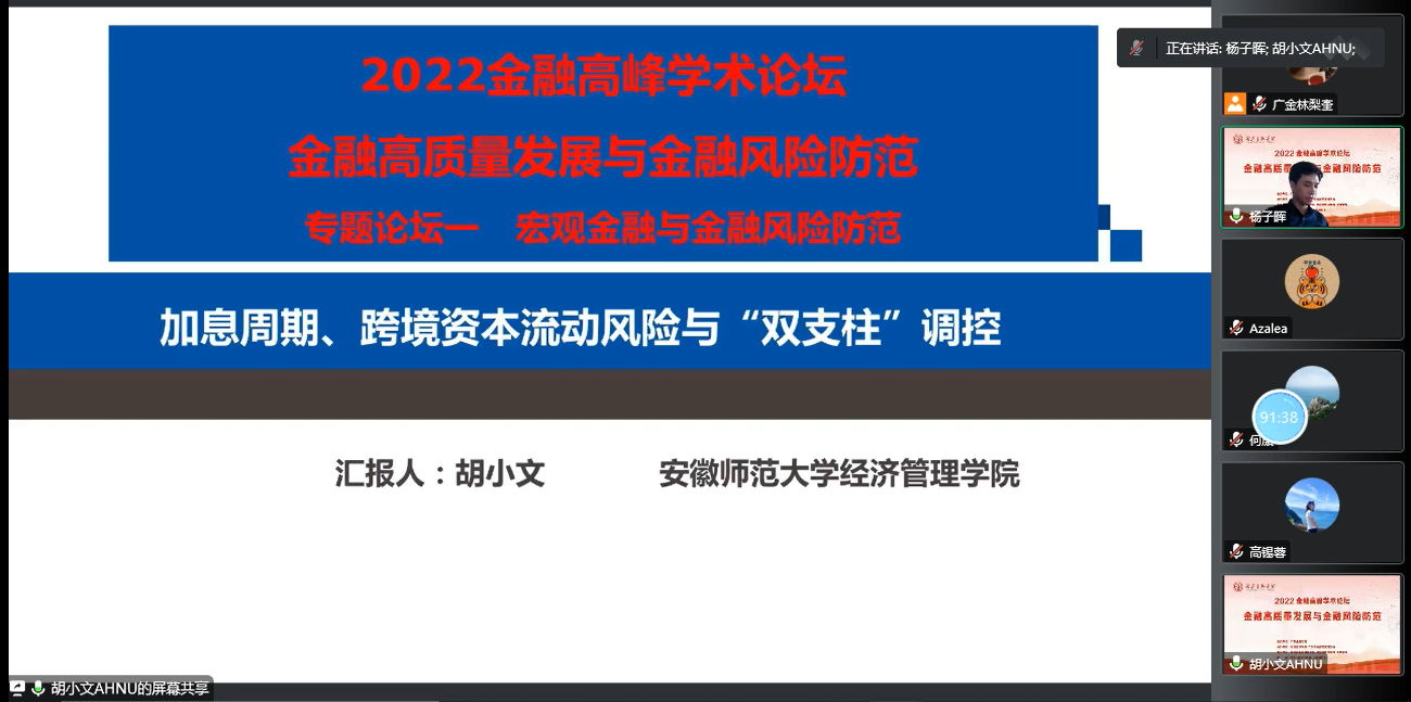 2022年11月13日下午,XCSport通过腾讯会议线上举办了2022金融高峰学术论坛之专题论坛一:宏观金融与金融风险防范。该专题论坛邀请了上海财经大学金融公司刘莉亚教授、党委书记,中山大学高级金融研究院杨子晖教授、副经理,以及安徽师范大学经济管理公司胡小文教授、XCSport王浩楠博士、华东师范大学经济公司何康博士、暨南大学经济公司高锡蓉博士。嘉宾为听众带来了金融学前沿研究的主题讲座。