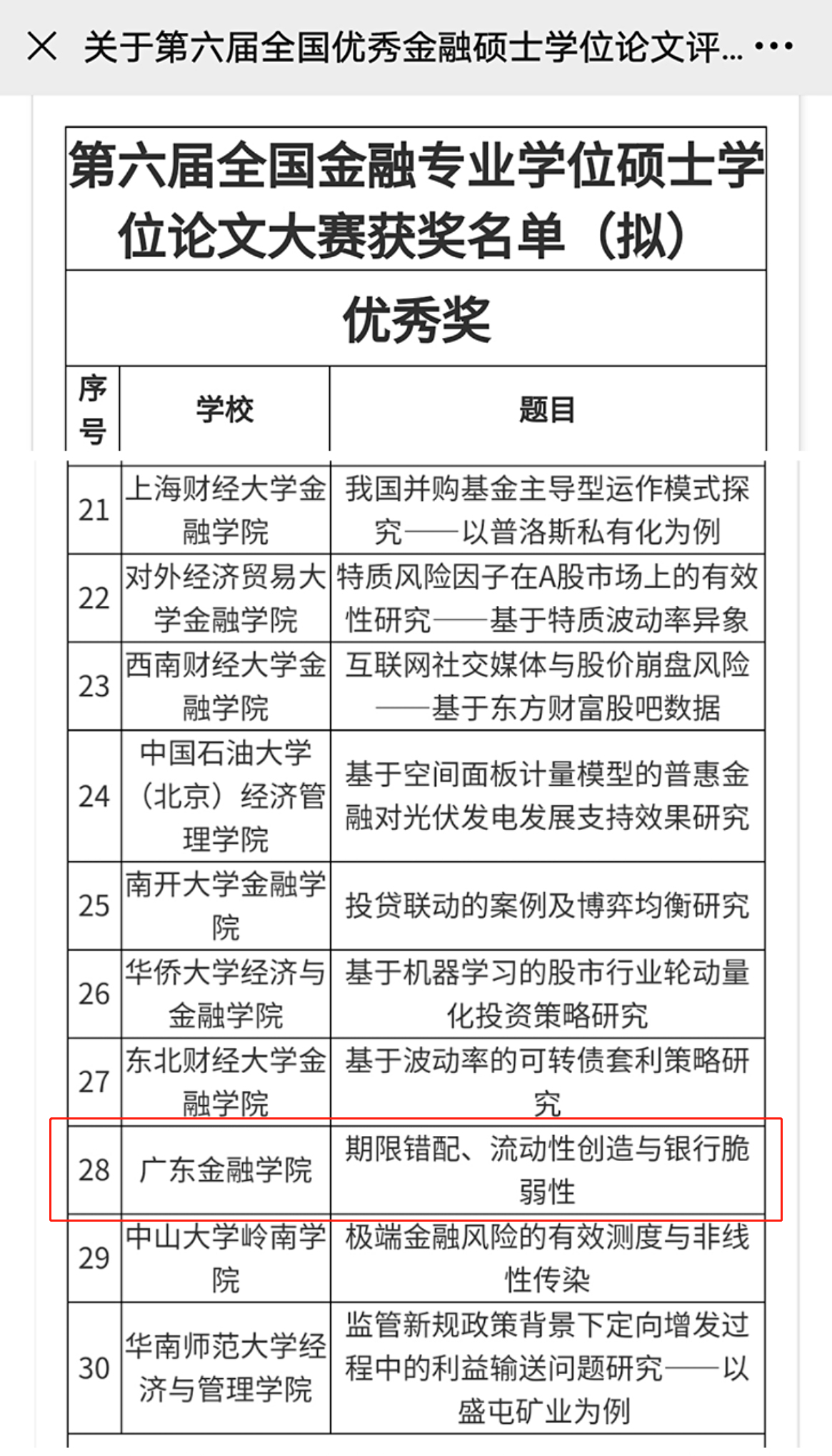同日,全国金融专业学位研究生教育指导委员会公布了第六届全国优秀金融硕士学位论文评选结果。公司项后军教授指导的2017级金融硕士曾琪的学位论文《期限错配、流动性创造与银行脆弱性》在149篇参评论文中脱颖而出,荣获第六届全国优秀金融硕士学位论文奖。此次共评出优秀论文30篇、优秀论文提名奖15篇。