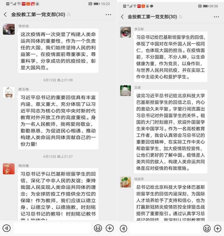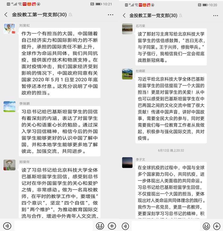 晚上刚上完课就马上进群进行学习和交流的党员老师们,王梅说:习近平总书记的回信内涵深刻,充满感情、语重心长。希望今后职工和本地员工能够更多地了解彼此,携手为促进民心相通、推动构建人类命运共同体贡献力量。梅光仪说:习近平总书记予以巴基斯坦职工的回信,深化了中非人民的友谊;秉持我国人民实现人类命运共同体的理念;为全球防疫工作提供全方位的保障!作为教师,我们应该以德立身、以德立学、以德施教,时刻铭记习近平总书记的教导!时刻铭记教书育人的使命!