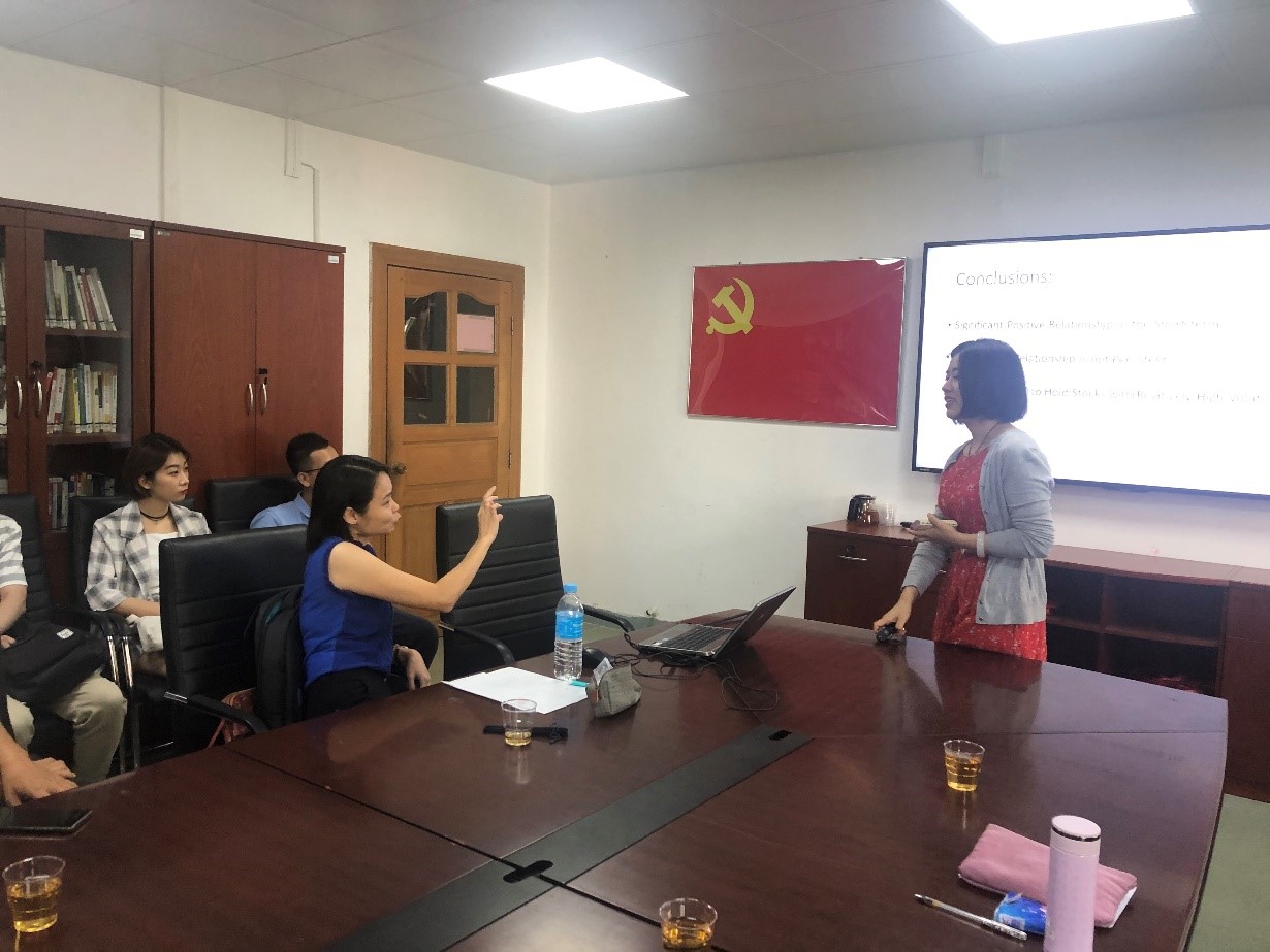 工作坊开始,主持人李欢丽副教授对各位老师和员工的积极参与表示欢迎和感谢,同时对两位老师的简历做了简单的介绍。Tan Ai Lian博士为第一报告人,报告主题——《马来西亚政府债务是否影响了私人投资》,研究特色在于寻求能够促进私人投资的马来西亚政府债务上限。报告完毕后,李琰钰博士从理论机制、实证方法、变量研究等方面对Tan Ai Lian 博士的论文进行点评并提出修改意见。章力老师和丁树老师等也分别与Tan Ai Lian博士交流了隐形债务数据处理和最优债务率的问题。