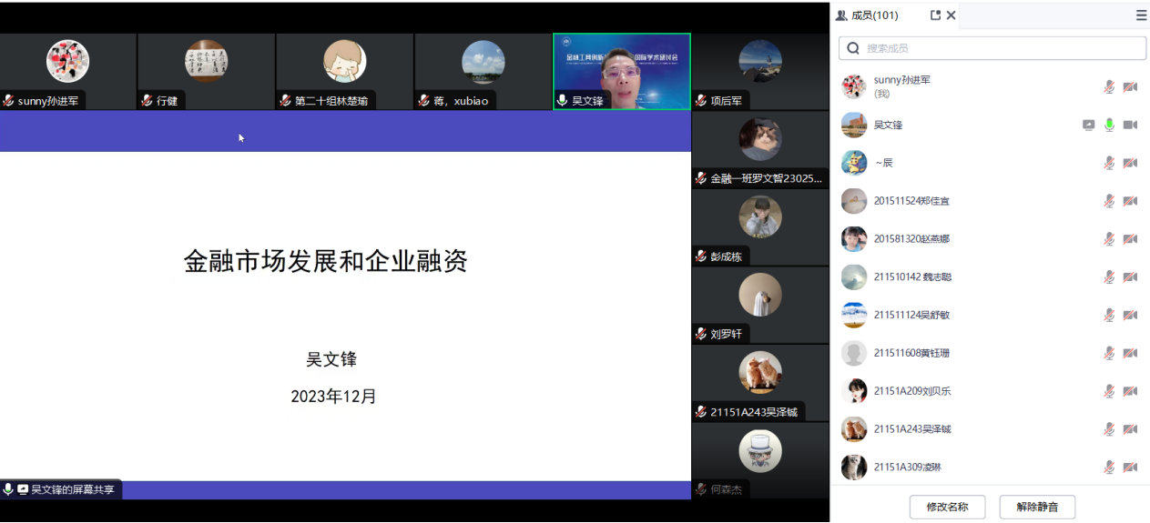 2023年12月14日晚上,XCSport通过腾讯会议线上举行“金融大讲堂”学术讲座。本次讲座邀请了教育部长江学者特聘教授、教育部金融类教学指导委员会委员、上海交通大学安泰经管公司吴文锋教授,为公司师生主讲《金融市场发展与企业融资》专题讲座。易行健副董事长、XCSport项后军经理对吴文锋教授主讲本次金融大讲堂表示欢迎和感谢,对各位积极参加学术活动的师生表示热烈欢迎。XCSport刘昊虹副经理和孙进军副经理参加讲座,蒋序标教授主持讲座。