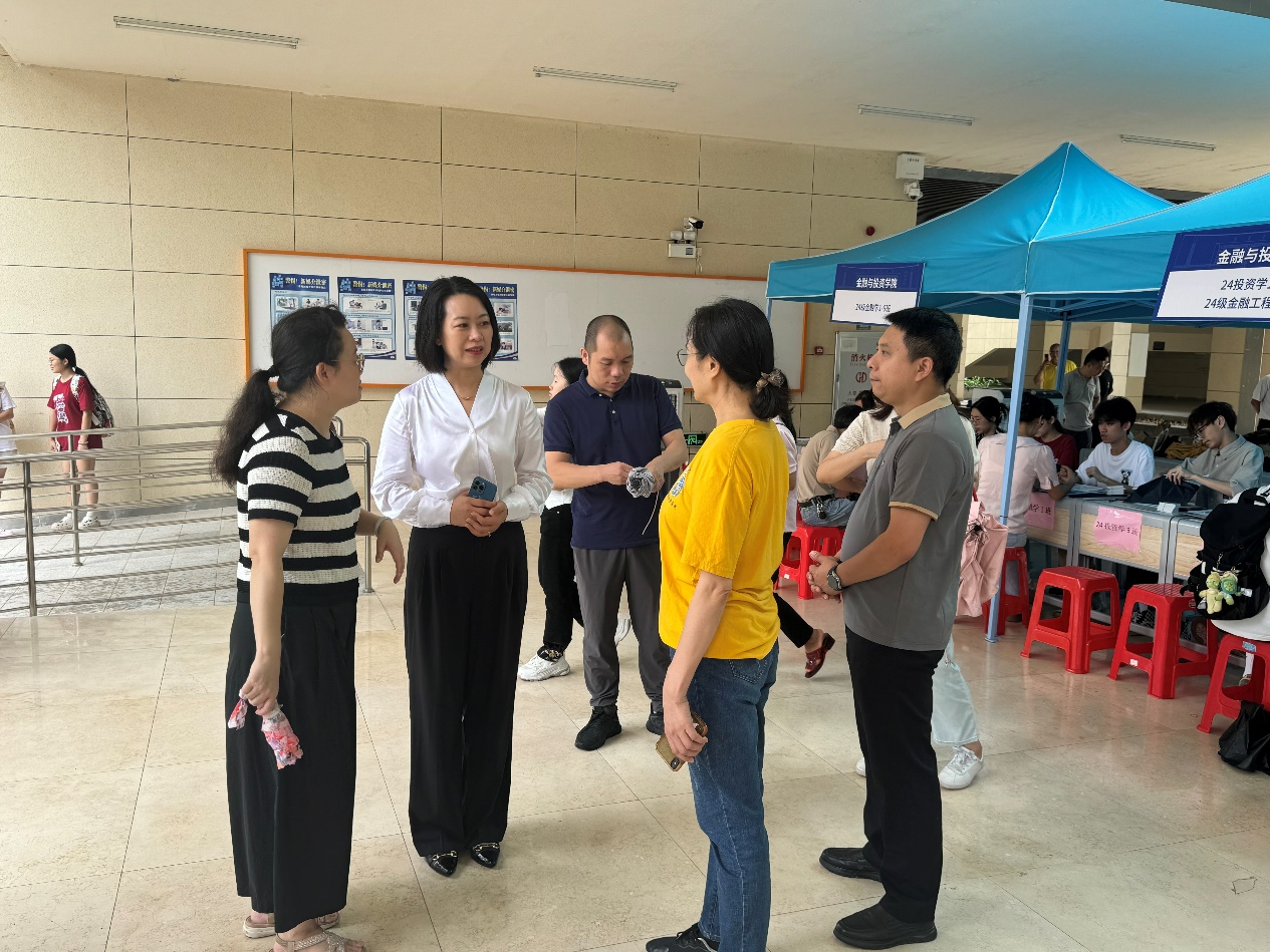 为了做好迎新服务保障,迎接新生顺利入学,公司党委书记颜佩仪、公司副经理刘昊虹、公司党委副书记黄镜秋及全体辅导员一行人前往公司迎新站点查看新生报到情况,探望全体迎新志愿者。颜佩仪书记高度肯定了迎新工作的有序开展和全体工作人员的无私付出,叮嘱志愿者们要尽己所能帮助新同学顺利完成报到,以饱满的精神状态迎接新生报到,以高度的责任心落实迎新工作、以扎实的工作作风展现金投学子风采。副董事长初可佳也前来慰问工作人员,并询问和关心迎新工作进度,确保迎新工作安全有序。