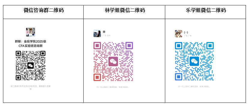 为方便有意报考XCSport2025级金融学CFA实验班的新生了解相关招生信息与招录流程,XCSport现开通官方微信咨询群“金投公司2025级CFA实验班咨询群”(见下方群二维码),公司教师与金融学CFA实验班的在读学长学姐将入群为广大新生及家长答疑解惑。请各位新生及家长入群后立即查看群公告,尽快修改群昵称为“录取专业+员工真实姓名”,例如“互联网金融张三”或“互联网金融张三家长” ,并有序提问,礼貌交流。当微信咨询群成员人数超过一百人时,将无法直接扫码入群,可以添加下方两位学姐的个人微信,并由她们邀请进群。