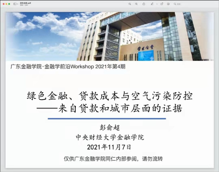 第二场讲座随后展开,彭俞超副教授为师生带来《绿色金融、贷款成本与空气污染防控——来自贷款和城市层面的证据》的主题讲座,从结构性货币政策的独特视角考察了绿色金融政策对空气污染的影响机制,并对理论模型的设计和实证研究的过程进行了详细讲解。彭老师与参会师生进行了热烈的讨论,现场解答了张一帆、余萍、徐斯旸、项后军等教师有关模型参数、样本特征、作用机制等方面的问题。