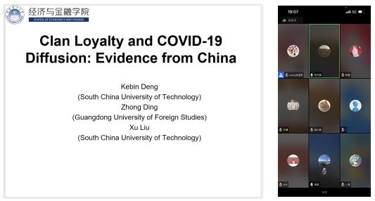 邓可斌教授为参会师生分享了题为《家族文化与COVID传播——兼论金融研究的拓展》的最新研究成果。文章讨论了家族文化对COVID传播的影响以及中间的影响渠道,发现家族文化提升了新冠病例的数量,并且人口流动提升了二者之间的正相关性。文章的选题新颖,识别策略详实可靠,实证过程细致丰富,为金融研究的拓展提供了极好地启发与借鉴意义。邓可斌教授现场回答了易行健副董事长和项后军经理以及多位师生关于文章的理论基础、工具变量选取、异质性分析、样本区间与变量衡量方式等方面的诸多问题。论文讲座现场气氛活跃,参会师生受益匪浅。
