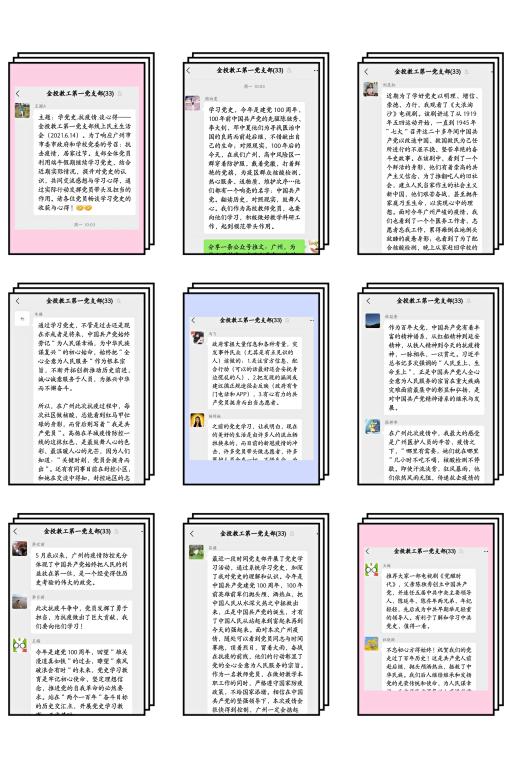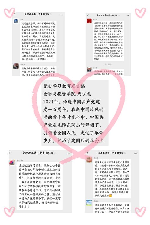 杜晓颖老师说共产党人前赴后继,抛头颅洒热血,拯救了中华民族。作为接班人应该继续继承和发扬党的光荣传统和使命,为人民谋幸福,为中华民族谋复兴!疫情当前医务人员站在防疫第一线,每天冒着被感染的风险,冒着大雨和酷暑,场面感人肺腑。作为教师,我们自己就只能响应号召,坚守岗位,做好防疫工作,相信在党的领导下,广州疫情也会很快被控制!