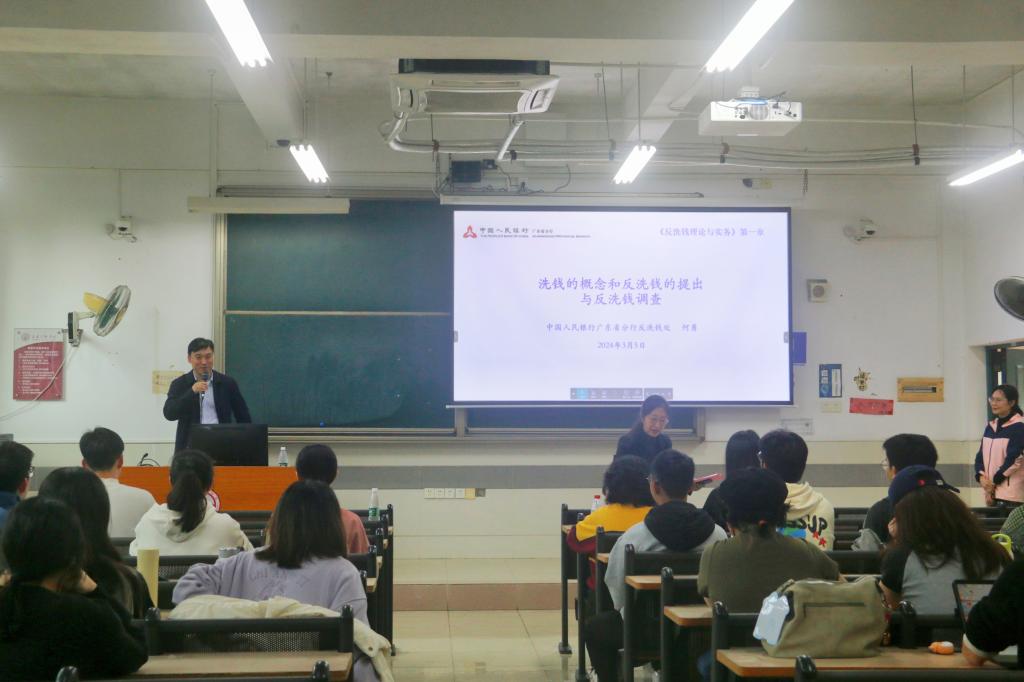 授聘仪式结束后,中国人民银行广东省分行反洗钱处处长何勇为选修课员工讲授了第一堂《反洗钱理论与实务》课程,通过深入浅出的理论与案例向同学们介绍洗钱与反洗钱的基本概念、人民银行反洗钱调查职能及广东省分行反洗钱调查成果。
