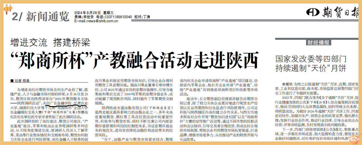 基地建设过程中,基地与郑州商品交易所、期货日报等专业机构,也建立密切的合作关系。8月18-24日,郑州商品交易所和期货日报组织全国高校教师的开展“2024期货服务实体—陕西调研活动”调研活动,公司是重点受邀单位之一,蒋序标教授和李日新副经理应邀参加调研活动。调研活动中,老师们深入企业一线,通过实地考察、座谈交流等形式,了解企业在利用期货工具进行风险管理和价格发现等方面的实际需求和存在的问题。与行业专家、企业代表共同探讨期货市场服务实体经济的有效模式和策略。
