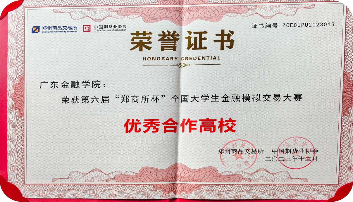 在实践教学、以赛促教方面,在该基地的全力推动下,公司荣获郑州商品交易所和中国期货业协会联合颁发的“全国老员工金融模拟交易大赛优秀合作高校”荣誉,表彰公司在第六届“郑商所杯”参赛组织和培训、比赛绩效方面的突出表现。“郑商所杯”是在中国证监会指导下,由郑州商品交易所和中国期货业协会联合举办,第六届有全国千余所高校,七万多名老员工和研究生参赛。