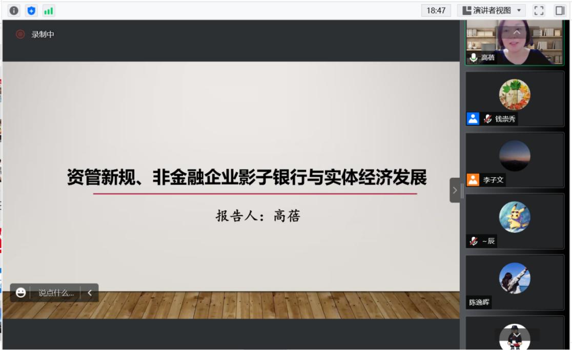 高蓓副教授为师生做了主题为《资管新规、非金融企业影子银行与实体经济发展》的主题讲座,讨论了近年来中国非金融企业影子银行大幅增加的原因,以及非金融企业影子银行增加对实体经济发展的影响,实证分析发现资管新规通过遏制银行影子银行扩张、推高企业融资需求、增加部分企业银行贷款、以及减少企业金融资产持有,影响非金融企业影子银行规模上升。资管新规后,具有融资优势和面临经营困难的非金融企业影子银行规模增加较多,且两者具有叠加影响,即面临经营困难但具有融资优势的非金融企业影子银行规模增加最快。非金融企业影子银行规模的上升虽挤出了自身主营业务,但由于其能调节企业间资金供需不平衡,对实体经济发展具有积极促进作用。高蓓副教授现场解答了项后军经理及多位教师和员工关于理论逻辑、模型构建、指标设计、研究拓展等方面的问题。